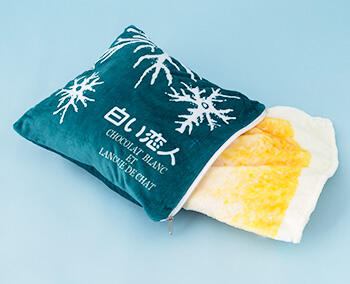 新発売グッズ「白い恋人クッションブランケット」を