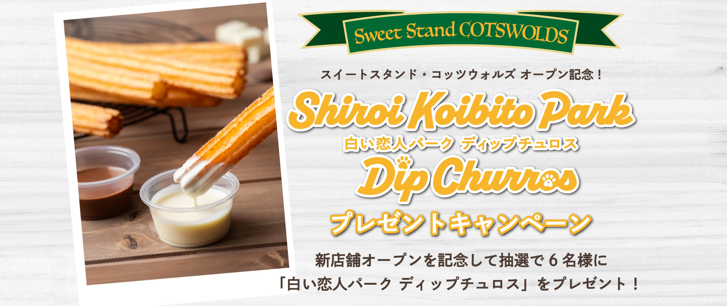オープンを記念して、イチオシメニュー「白い恋人パーク ディップチュロス」を抽選で6名様にプレゼント!