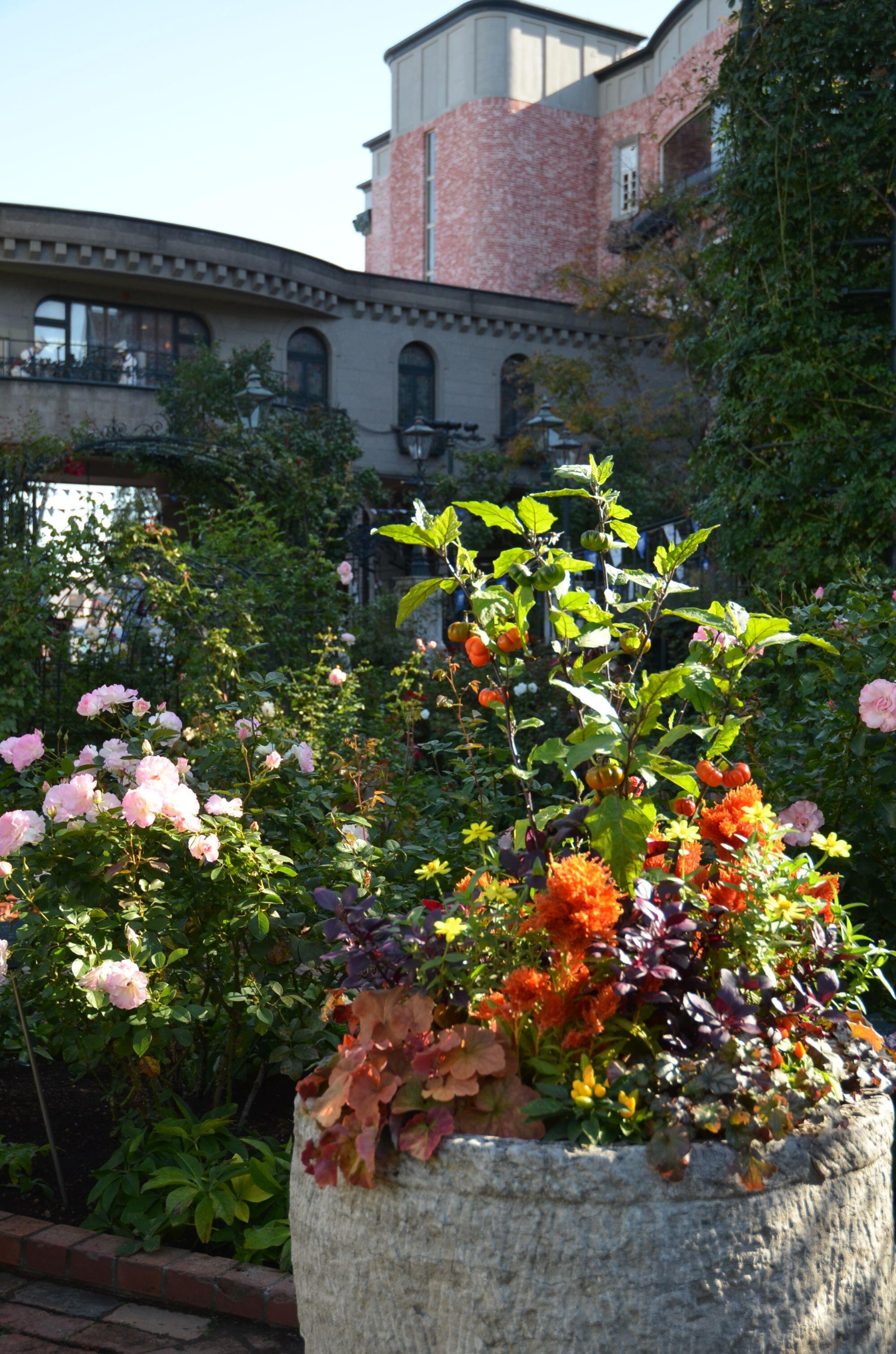 中庭はカボチャやマリーゴールドでハロウィンカラーに染まっています。