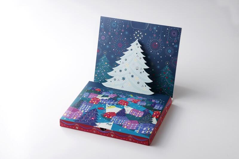 オーナメントが描かれた華やかな箱を開くと、イルミネーションで煌びやかに彩られる街並みとクリスマスツリーが目の前に広がります。