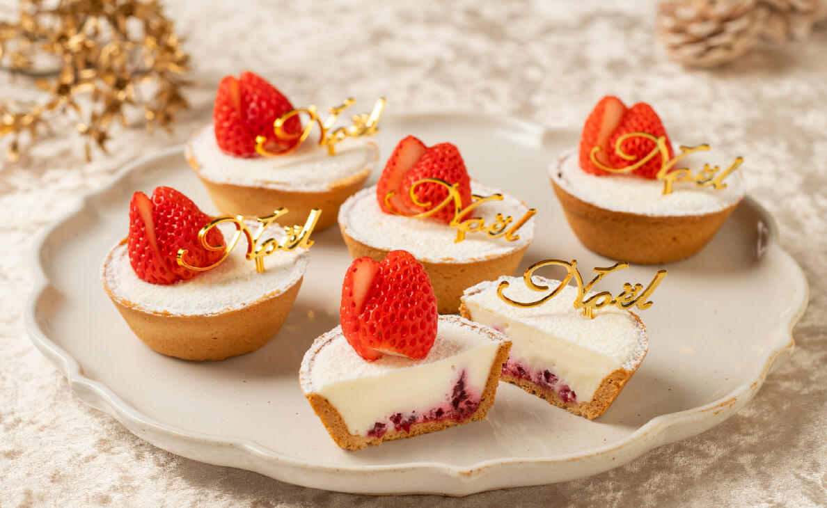 白い恋人のホワイトチョコレートを使用したムースタルト。中に隠れたラズベリーと飾りのいちごがアクセント♪